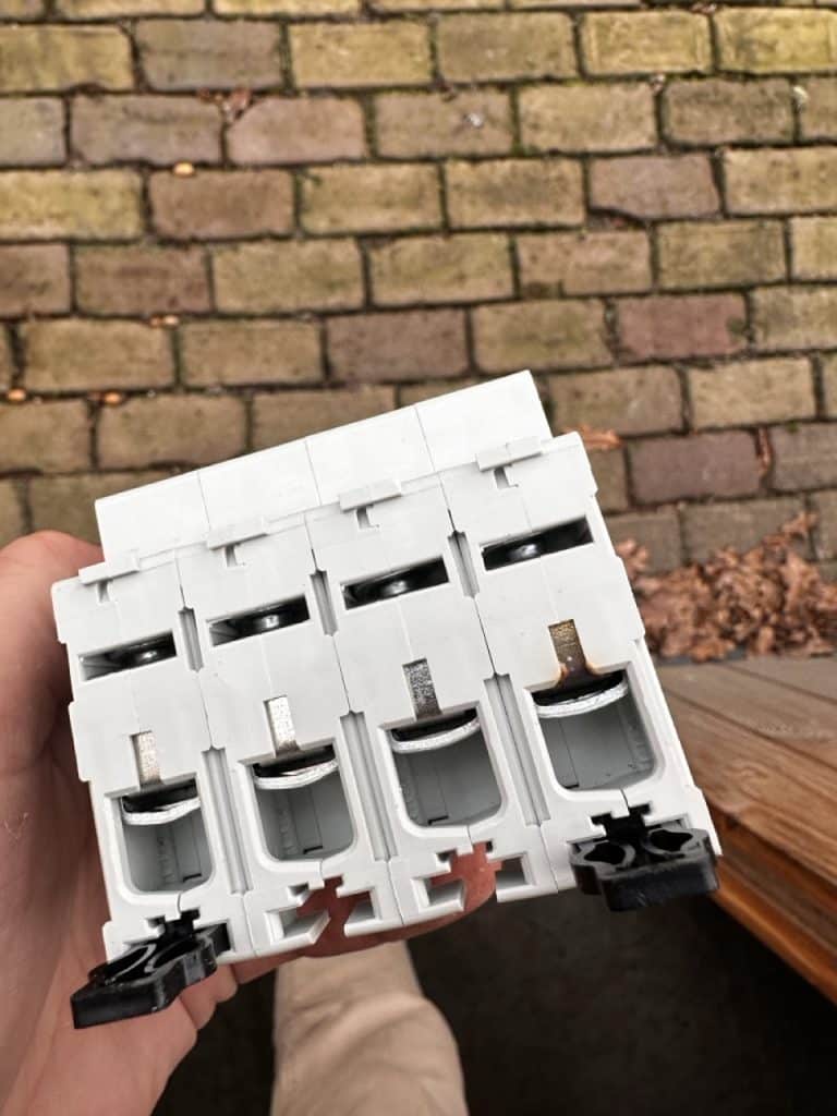 Tijdens de inspectie is vastgesteld dat de nulkabel in de hoofdschakelaar niet correct was aangedraaid en los in de schakelaar zat, waardoor op enig moment kortsluiting is ontstaan en de hoofdschakelaar beschadigd raakte. Om de veiligheid van de installatie te herstellen en verdere storingen te voorkomen, is de defecte hoofdschakelaar volledig vervangen en zijn alle aansluitingen opnieuw gecontroleerd en correct vastgezet, waarna het Enphase systeem weer normaal kon communiceren met de monitoring en de opbrengstgegevens weer zichtbaar werden in de app.